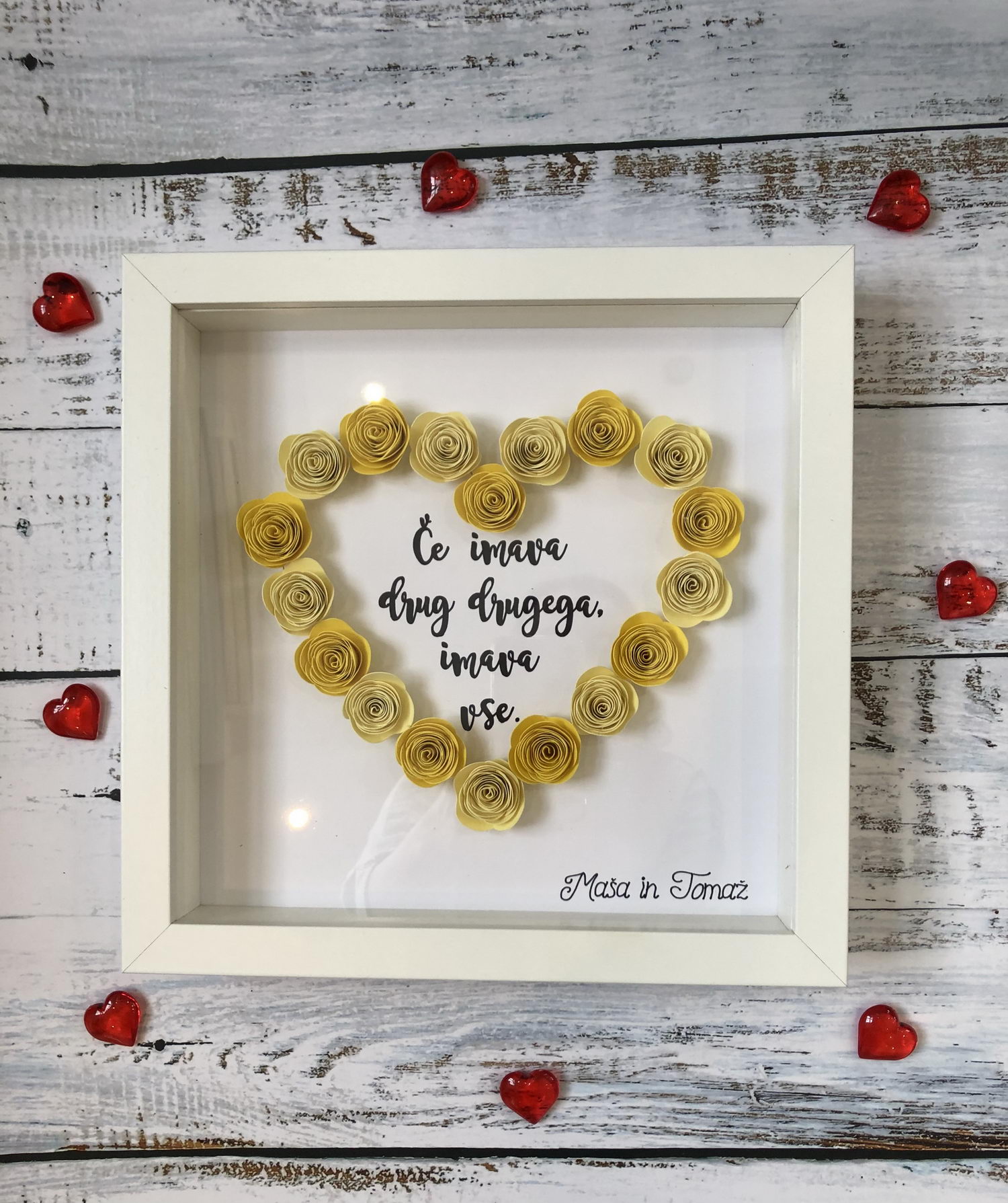 Okvirji z ročno narejenimi rožicami ali drugimi papirnatimi dodatki in napisom.